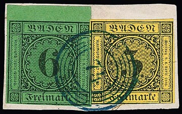 6 Kr. schw./gelbgrün, vollrandiges Kabinettstück mit oberem Bogenrand, nebst weitgehend vollrandiger 3 Kr. schw./gelb auf dekor. Briefstück mit blauem NS "74" (Krotzingen)