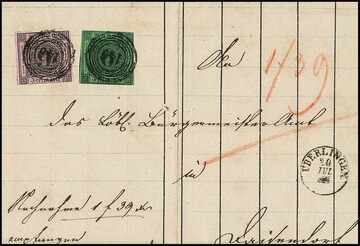 6 Kr. schw./gelbgrün und 9 Kr. schw./rosa, je etwas berührt, als seltene innerbadische 15 Kr.-Frankatur auf Rechnungs-Nachnahmebrief mit NS "146" und K1 "Überlingen" in den Landbezirk von Meersburg in ursprünglicher Erhaltung