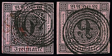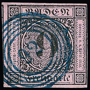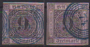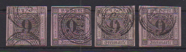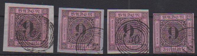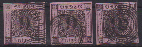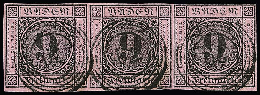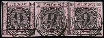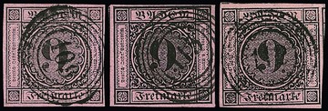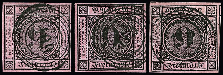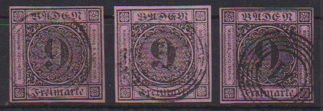 9 Kr. schw./rosa, drei Werte je mit blauen NS, "66" (Jestetten), "74" (Krotzingen) und "92" (Möskirch)
