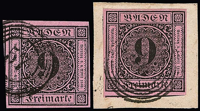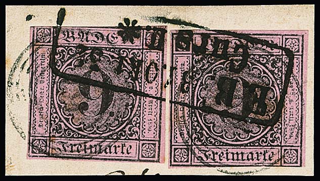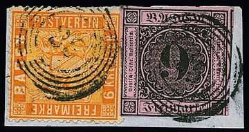 9 Kr. schw./rosa, zwei Briefstücke mit besseren Mischfrankaturen, einmal (9 Kr. Bugspur) nebst 3 Kr. schw./grün und klarem roten NS "115" (Rastatt), sowie nebst Luxus-Randstück 6 Kr. schw./gelborange (sign. Seeger)
