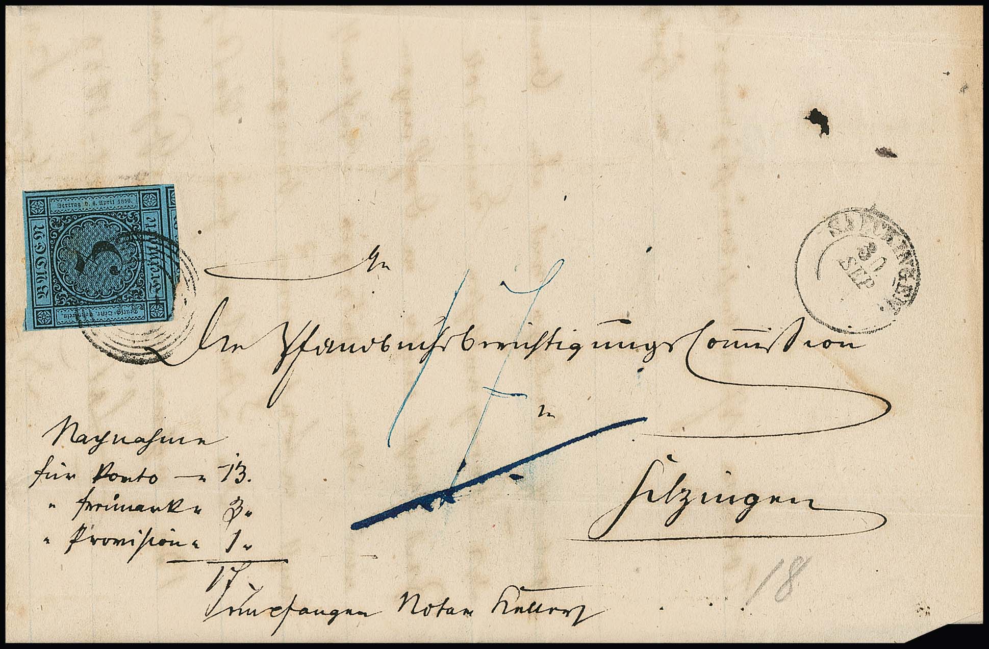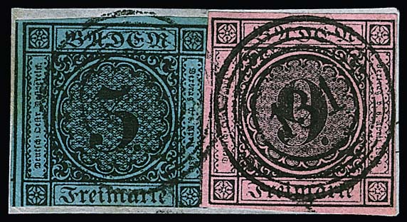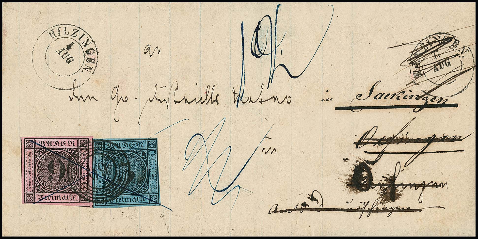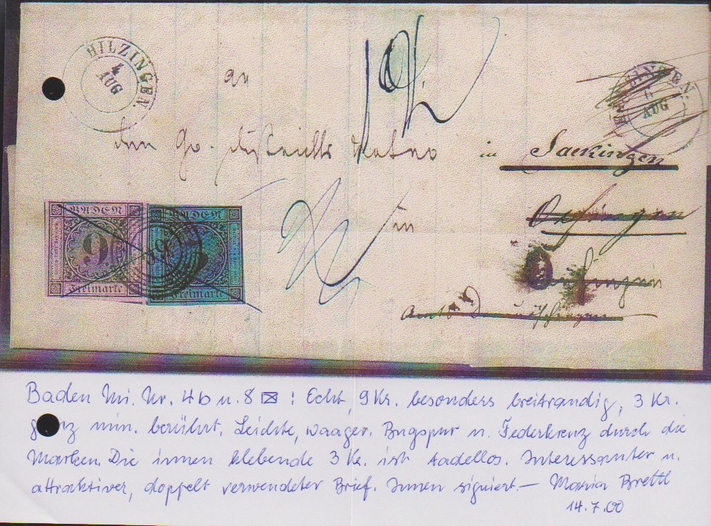 9 Kr. schw./rosa, riesenrandig, in Mischfrankatur mit 3 Kr. schw./blau (leichte Druckstelle), auf Brief mit NS "60" und K2 "Hilzingen" nach Oefingen bei Donaueschingen, dann mit Federkreuz und Taxe "12" (Kr.) nach Oefingen bei Geisingen weitergesandt, innen doppelt verwendet (gut zeigbar) mit 3 Kr. schw./blau von Säckingen nach Hilzingen. Kombinationen der Nr. 4b mit Nr. 8 sind sehr selten und wahrscheinlich keine handvoll existent. Fotoexp. Brettl