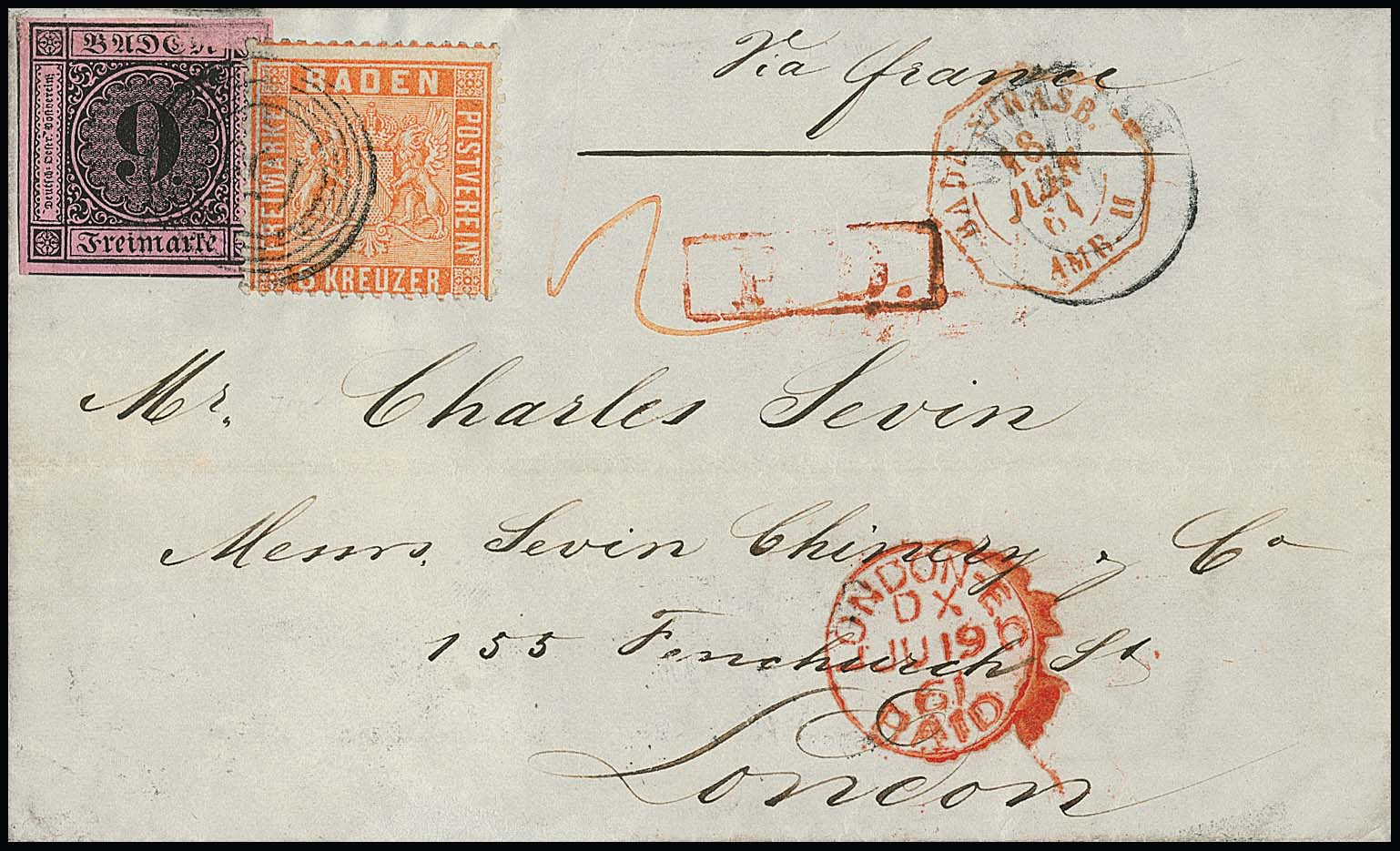 9 Kr. schw./rosa (oben rechts geschürft) in Mischfrankatur mit gezähnter 6 Kr. lachsrot auf Faltbrief mit NS "156" und K2 "Weinheim", 19.6.1861, nach London. Brief rs. Spuren, seltene Kombination