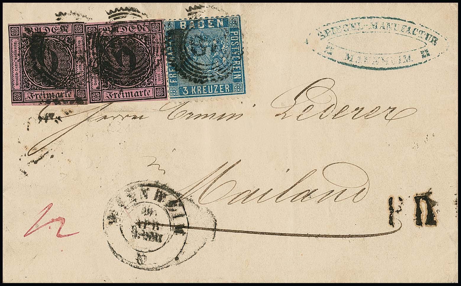 9 Kr. schw./dunkelrosa, zwei Exemplare in Mischfrankatur mit gezähnter 3 Kr. preußischblau auf Faltbrief von Mannheim (K2 und Zackenkranz-NS "87") 1861 nach Mailand. Trotz kleiner Beanstandungen eine seltene Kombination (Kaufpreis Erhardt 1988 = DM 2800,-). Rückseitig alle Stempel und geteilte Franko-Abgeltung "25/30"