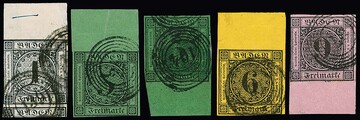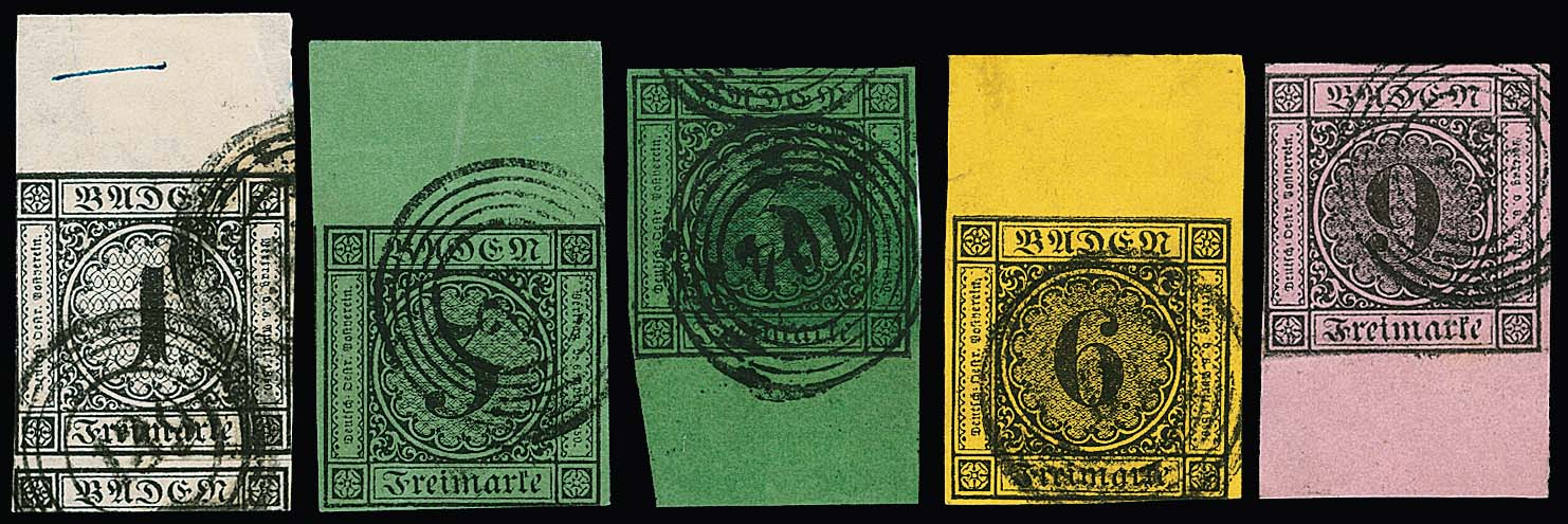 9 Kr. schw./rosa, 1 Kr. schwarz, zweimal 3 Kr. schw./grün und 6 Kr. schw./gelborange, fünf Werte je mit 12 bis 15mm breitem Bogenrand oben bzw. unten. Einseitig gering berührt bzw. eine 3 Kr. hell