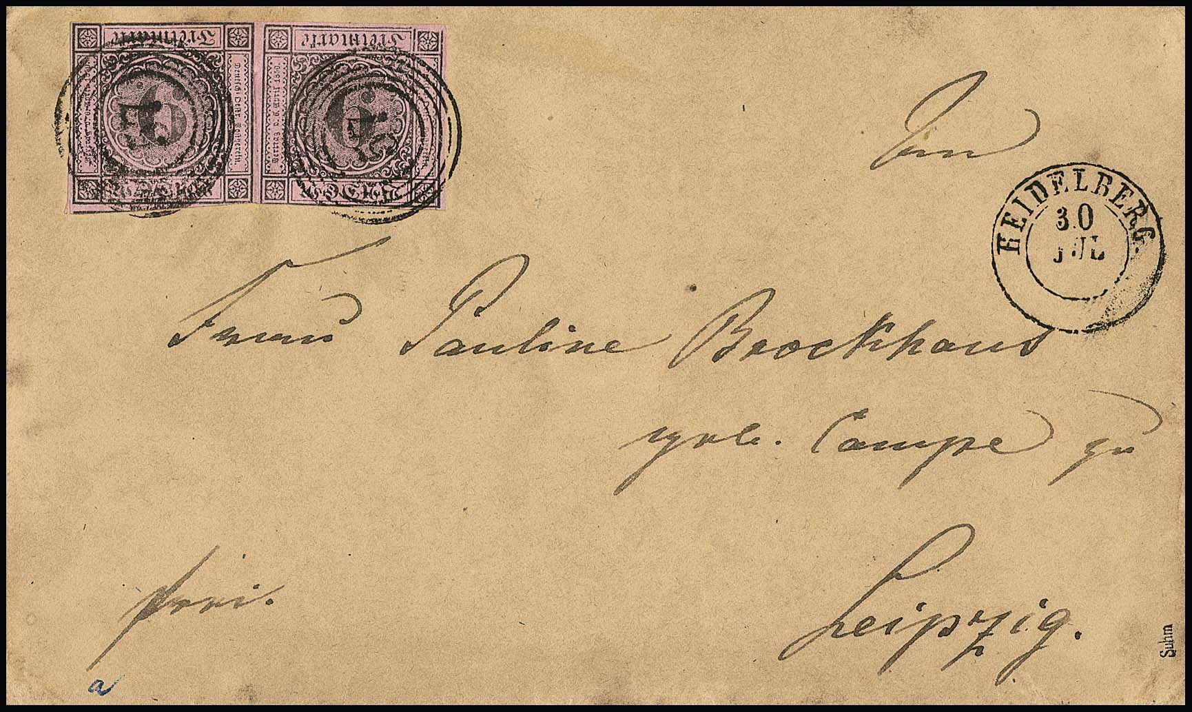 9 Kr. schw./lilarosa im waager. Paar (im Zwischenraum Vortrennschnitt) mit NS "57" und K2 "Heidelberg" auf gelbbraunem Brief nach Heidelberg, sign. Starauschek