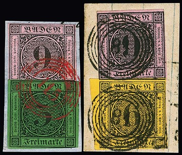 9 Kr. schw./rosa, sechs ausgesuchte Kabinett-/Luxusstücke, davon vier Briefstücke, einmal vom Oberrand