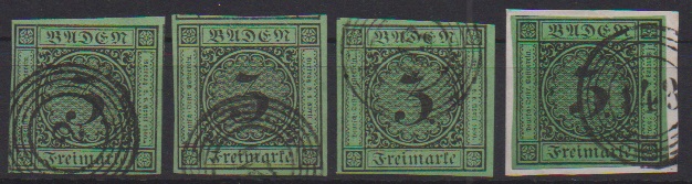 3 Kr. schw./grün, sechs ausgesucht breit- bis überrandige, meist Luxusstücke, teils sign.