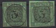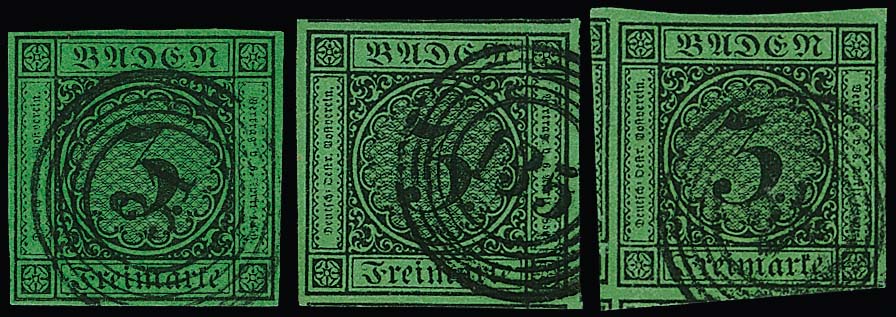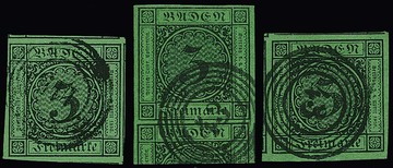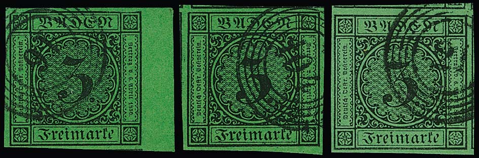 3 Kr. schw./grün, drei ausgesucht überrandige Kabinett-/Luxusstücke mit Nebenmarken