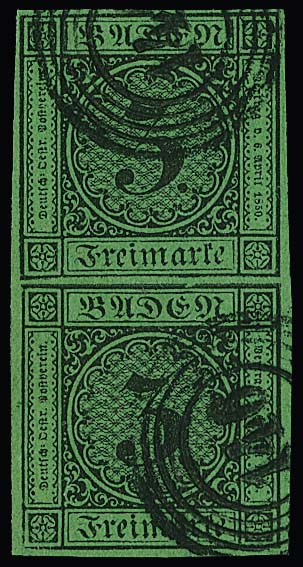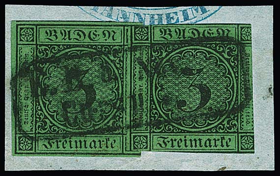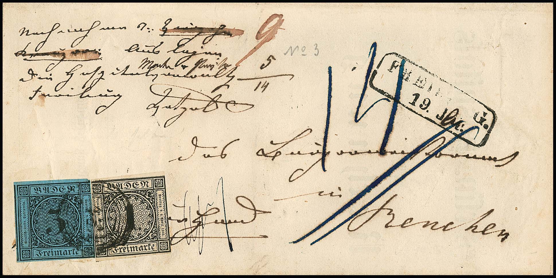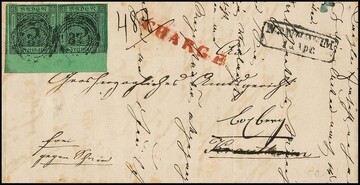3 Kr. schw./grün im Paar mit 9mm breitem unterem Bogenrand (andere Seiten Randrep.) auf Nachsende-Chargébrief aus Mannheim