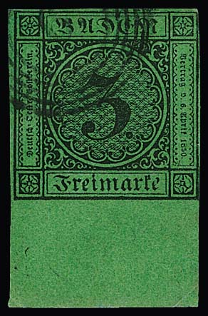 3 Kr. schw./grün, Prachtstück mit unten 12,5mm breitem Bogenrand