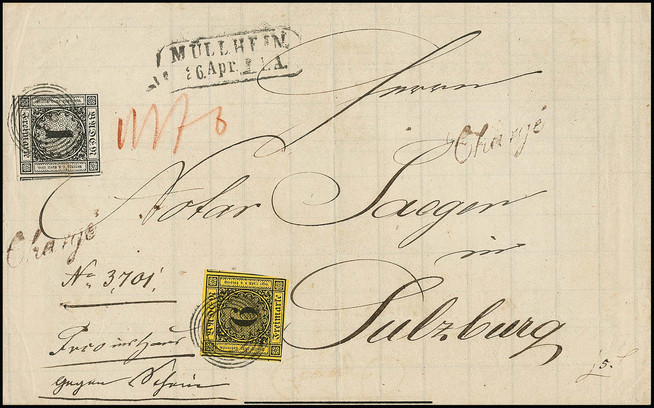 1 Kr. schwarz (kl. Mgl.) und teils überrandige 6 Kr. schw./gelborange auf provisor. hergestelltem Chargé-Couvert mit NS "95" und Ra2 "Müllheim" nach Sulzburg