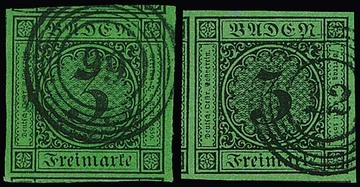 3 Kr. schw./grün, zehn ausgesucht breit- bis überrandige, meist Luxusstücke