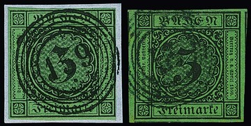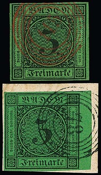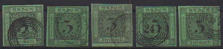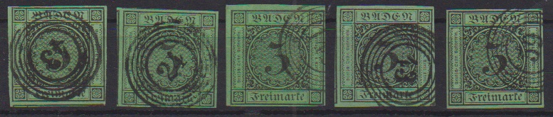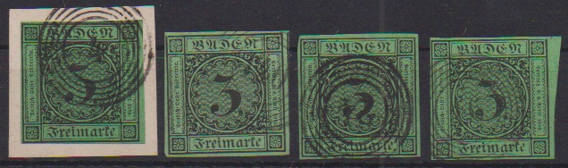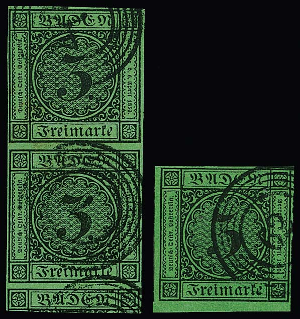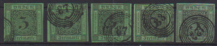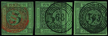 3 Kr. schw./grün, sieben ausgesuchte Kabinett-/Luxusstücke, dabei roter NS "115"