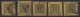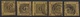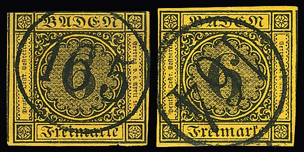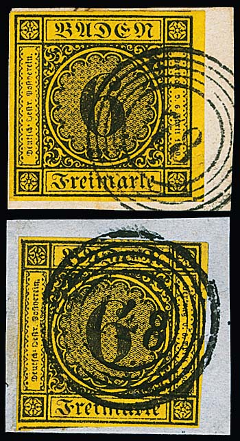 6 Kr. schw./gelborange, zwei Werte mit klaren Uhrradstempeln, "5" (v. Unterrand) und "18" (Bfst. mit Nebenmarken)