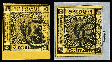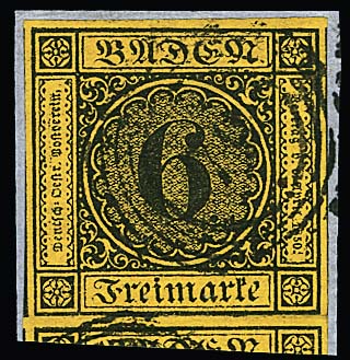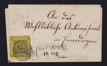 6 Kr. schw./gelborange, riesenrandiges Kabinettstück, drei Nebenmarken, unten Bogenrand, auf kleinem Briefchen aus Carlsruhe