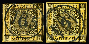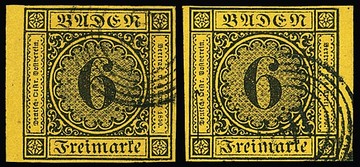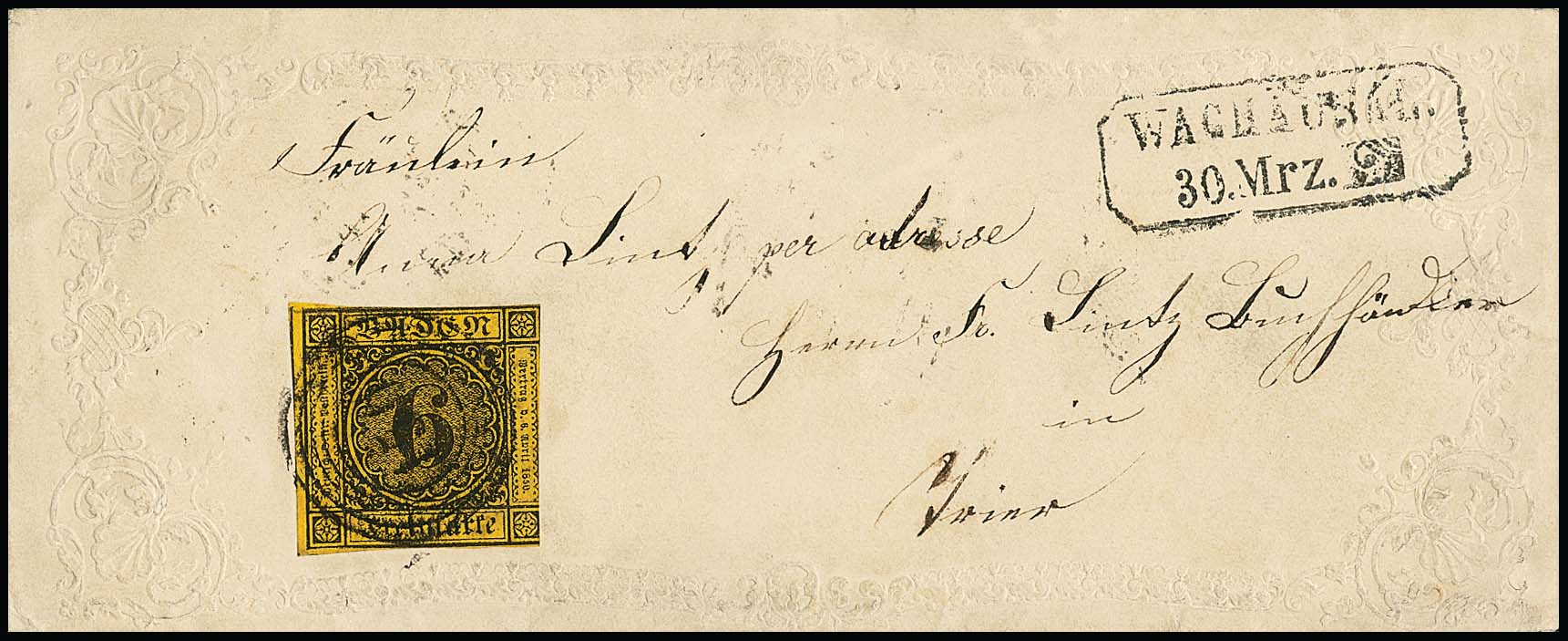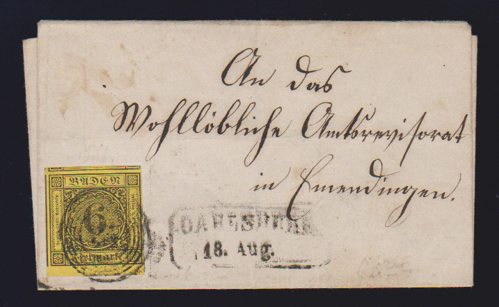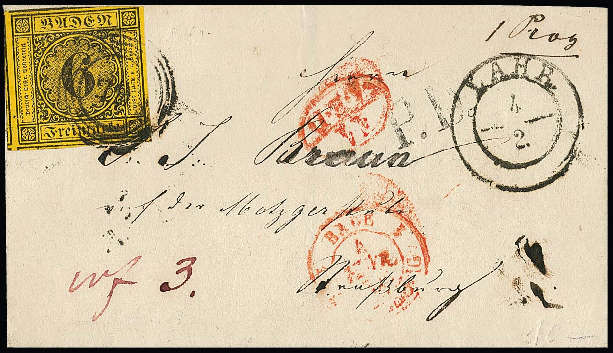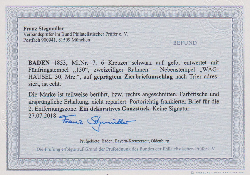 6 Kr. schw./gelborange, teilweise berührt bzw. angeschnitten, auf hübschem Prägezierbrief aus Waghäusel. Fotoexp. Stegmüller