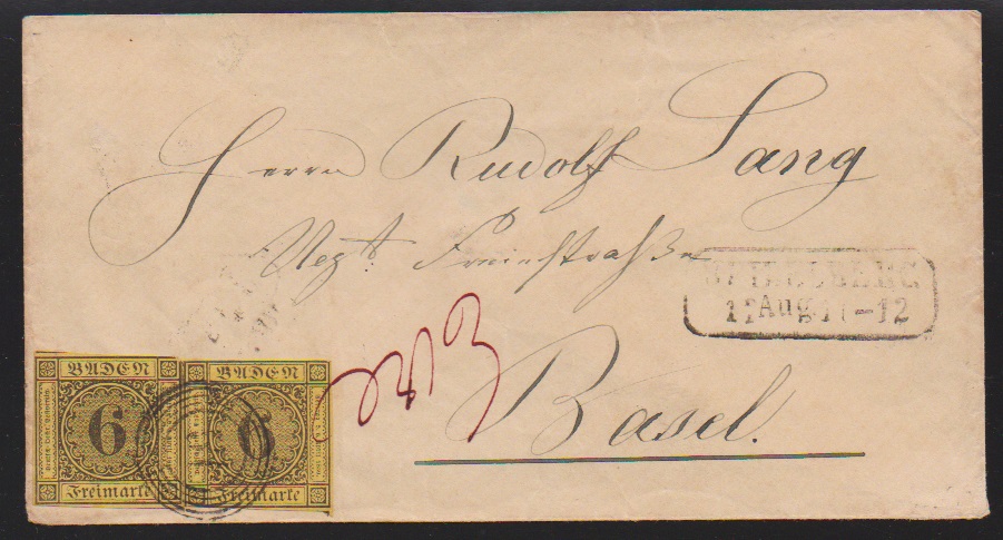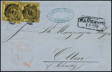 6 Kr. schw./gelborange, jeweils Doppelfrankaturen (typischer Schnitt) auf zwei Auslandsbriefen von Mannheim in die Schweiz (Olten bzw. Rheinfelden)