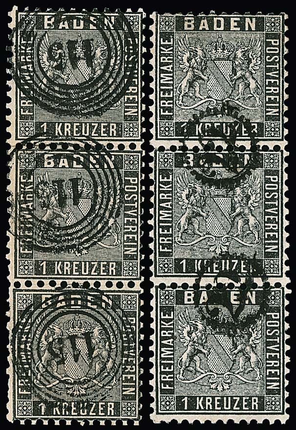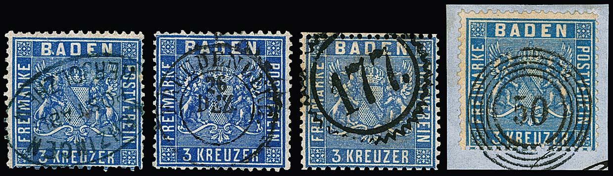 3 Kr. ultramarin (deutlich unterschiedliche Nuancen), vier Werte mit schönen Abstempelungen, u.a. Luxusstück mit ideal zentrischem K2 "Freudenberg", sowie blauer Postablagestempel "Kenzingen-Herbolzheim"