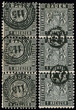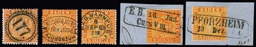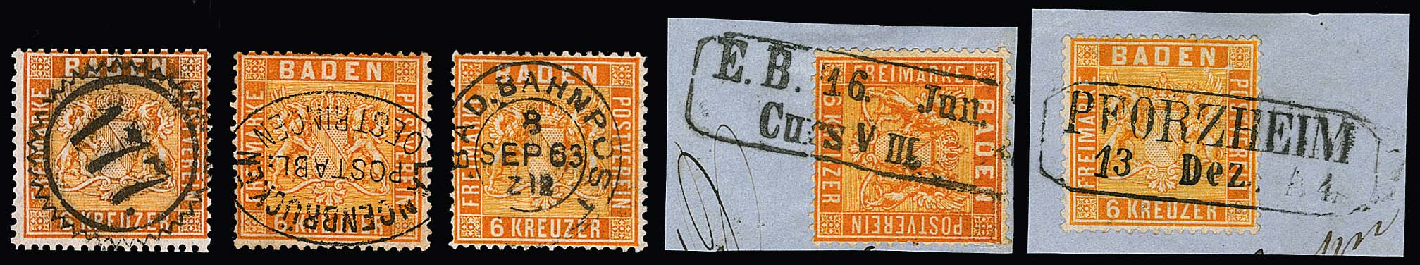 6 Kr. orange, fünf Werte mit teils ungewöhnlichen Entwertungen, u.a. Zackenkranz-NS "177", Postablage "Langenbrücken-Oestringen", Bahnpost-K2 und Eisenbahn-Curs-Ra2 (Bfst.)