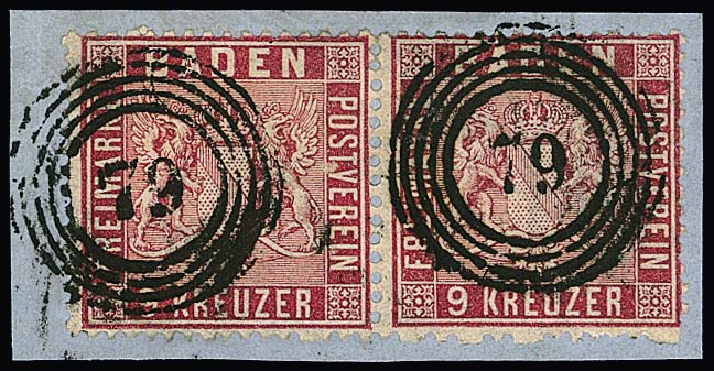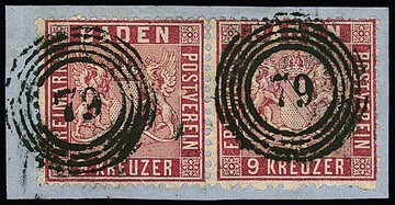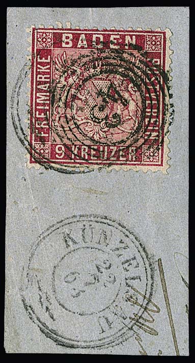 9 Kr. karmin, gut gezähnt, auf Kabinettbriefstück mit seltener Doppelentwertung durch badischen NS "43" und württembergischen K2 "Künzelsau"