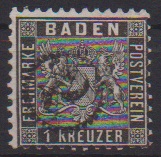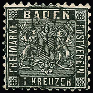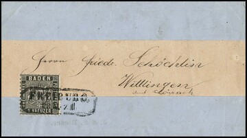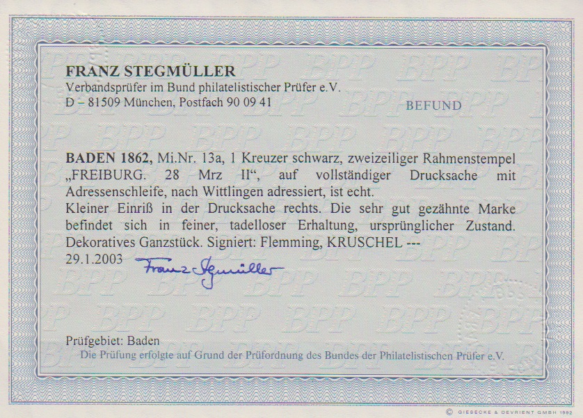 1 Kr. schwarz, Kabinettstück auf vollständiger Drucksache, Streifband plus Inhalt, dieser rechts kl. Randriß, mit Ra2 "Freiburg". Sign. Kruschel, Flemming und Fotoexp. Stegmüller