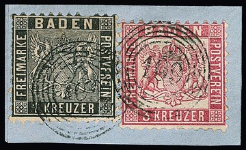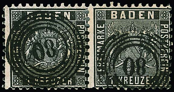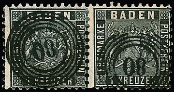 1 Kr. schwarz, Kabinettpaar mit Doppelentwertung durch K2 "Stockach" und Postablage-Stempel "Stockach-Liptingen" zentrisch. Mi. 300,- +