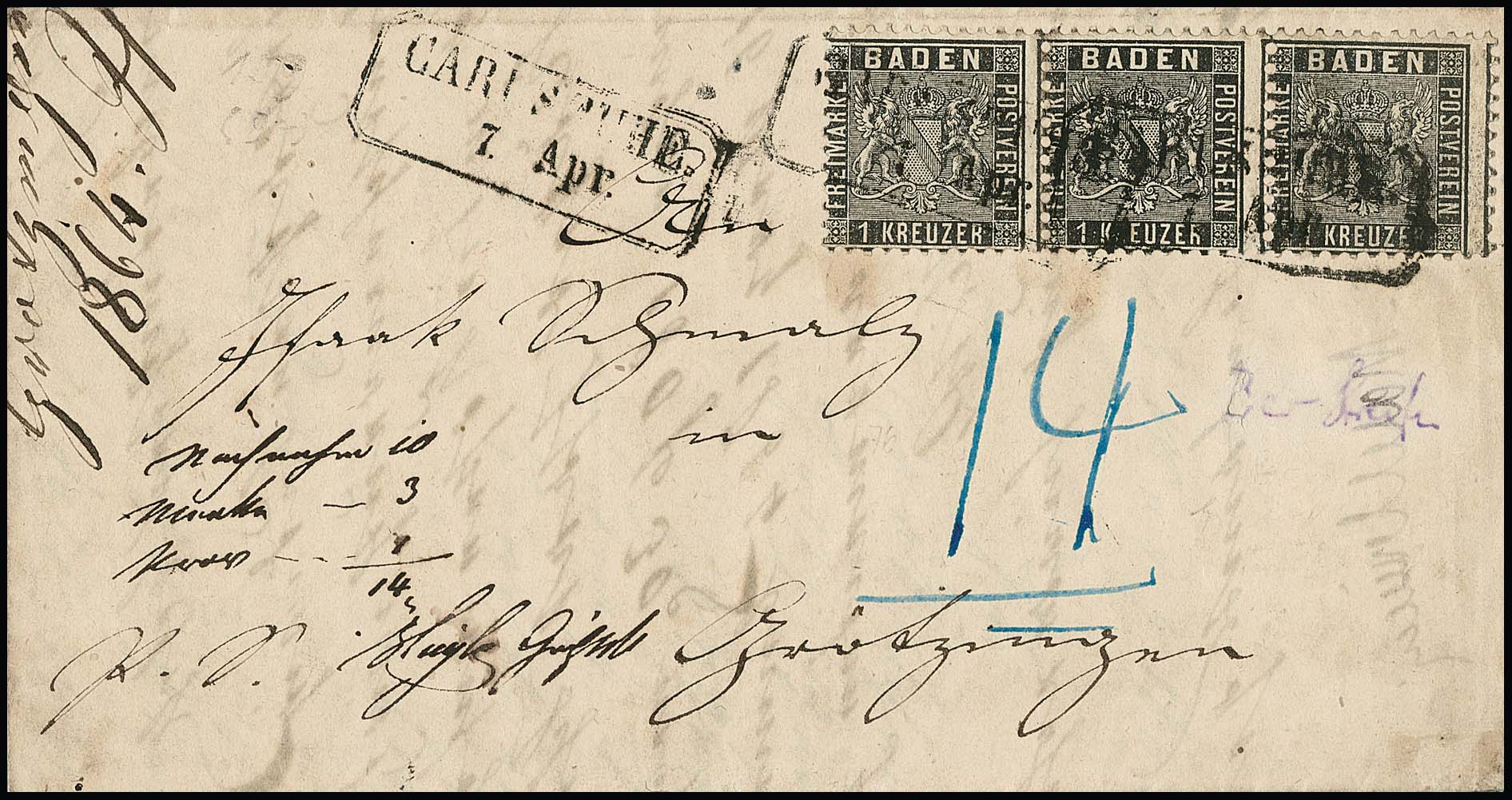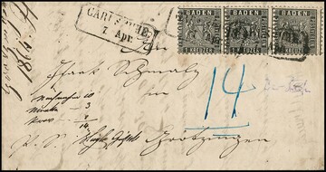 1 Kr. schwarz, Kabinett-Dreierstreifen auf NN-Brief (leichte Spuren) mit Ra2 "Carlsruhe", Mi. 400,-