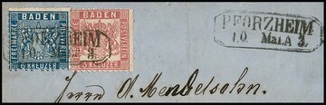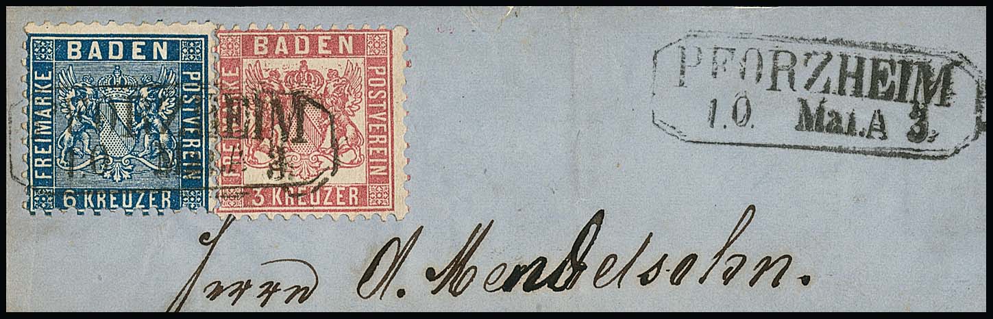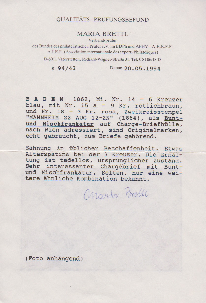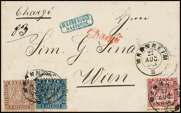 6 Kr. blau und 9 Kr. braun, Prachtstücke in Mischfrankatur mit 3 Kr. rosa (etwas Patina) auf Einschreibebrief der 2. Gewichtsstufe mit K2 "Mannheim" nach Wien. Seltene, nur noch ein weiteres Mal registrierte Kombination aus der Koch-Slg. (Corinphila 1994, Zuschlag SFr. 1700,-), Attest Brettl