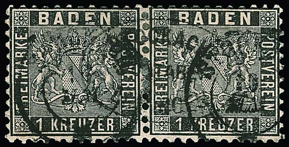 1 Kr. schwarz, Prachtpaar (eine verkürzte Zahnspitze) mit NS "80" (Langenbrücken), Mi. 300,-