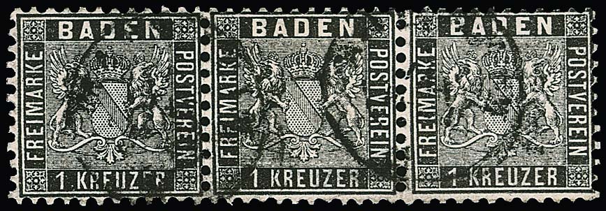 1 Kr. schwarz, waagerechter Pracht-Dreierstreifen mit K2 "Mannheim", Mi. 500,-