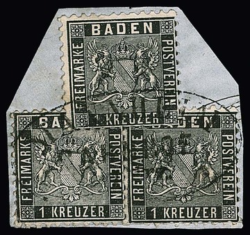 1 Kr. schwarz, drei Exemplare dekorativ geklebt auf Briefstück mit großem Ovalstempel "Mannheim Bahnhof", zwei leicht verkürzte Zähne, sign. Englert