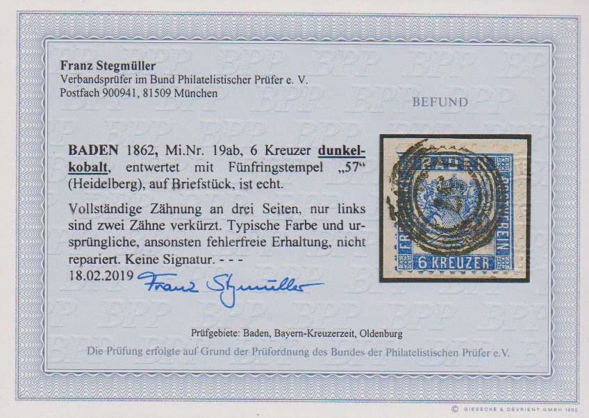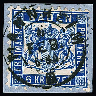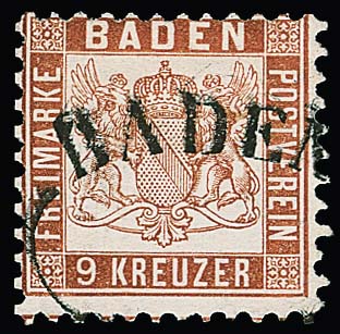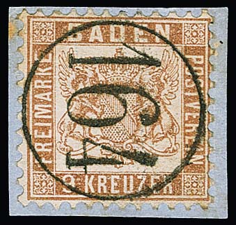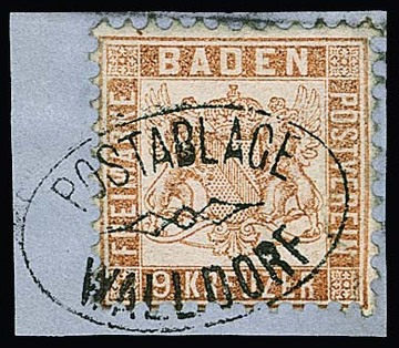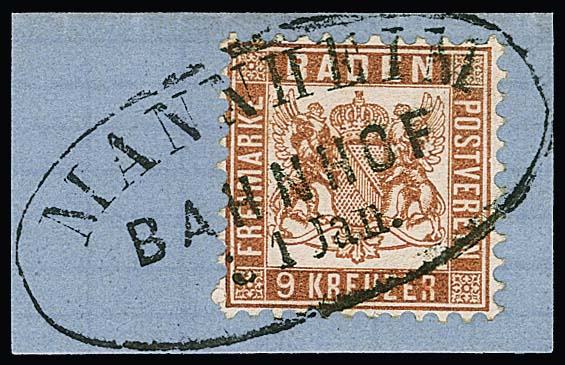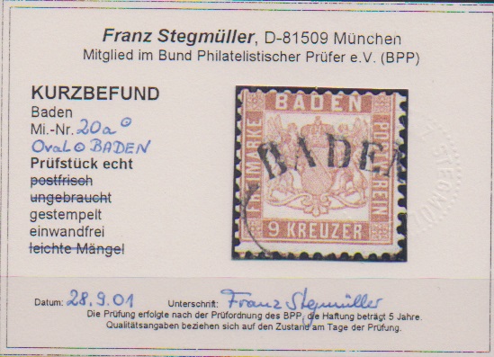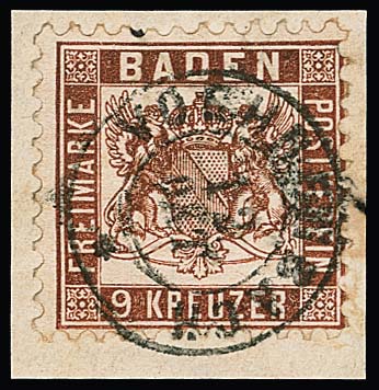 9 Kr. rotbraun, Kabinettstück mit besserem Ovalstempel "Baden", Fotoexp. Stegmüller
