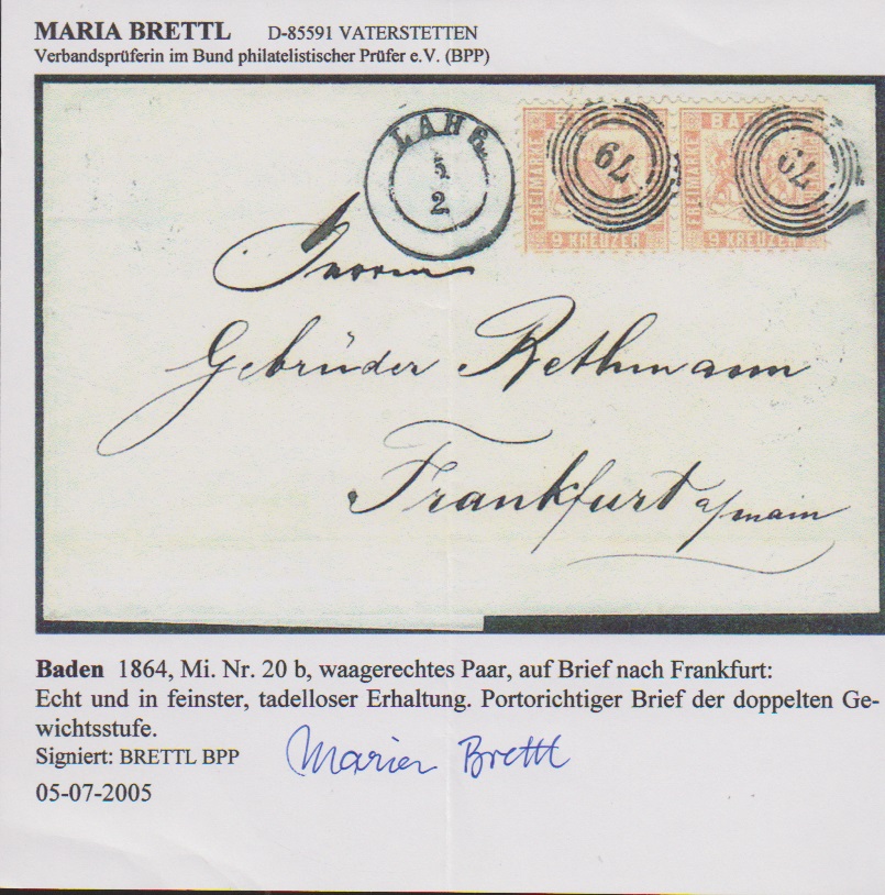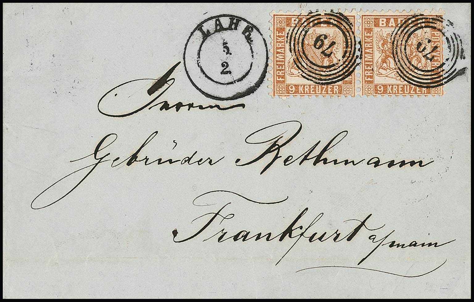 9 Kr. fahlbraun im Paar auf Kabinett-Doppelbrief mit NS "79" und K2 "Lahr" nach Frankfurt, Fotoexp. Brettl. Mi. 600,-