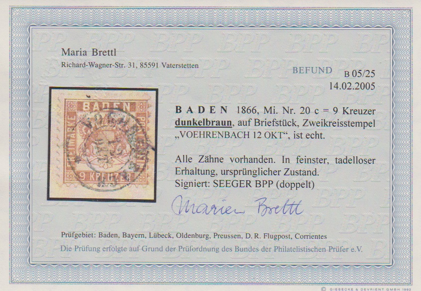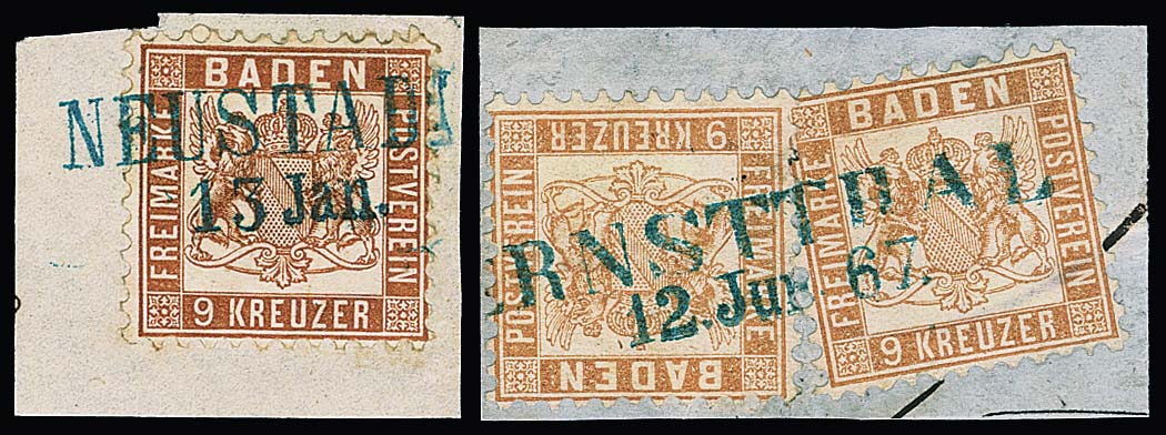 9 Kr. gelb- und dunkelbraun (letztere auf Briefstück mit K2 "Voehrenbach"), je gest. Kabinettstücke, sign. Stegmüller, Seeger und für Nr. 20c zusätzlich Fotoexp. Brettl. Mi. 720,-