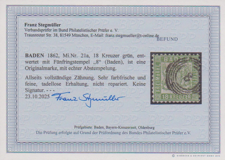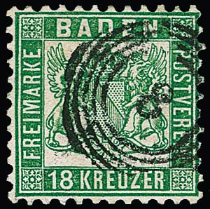 18 Kr. grün, gut gezähntes Kabinettstück mit NS "8" (Baden), Fotoexp. Stegmüller. Mi. 700,-