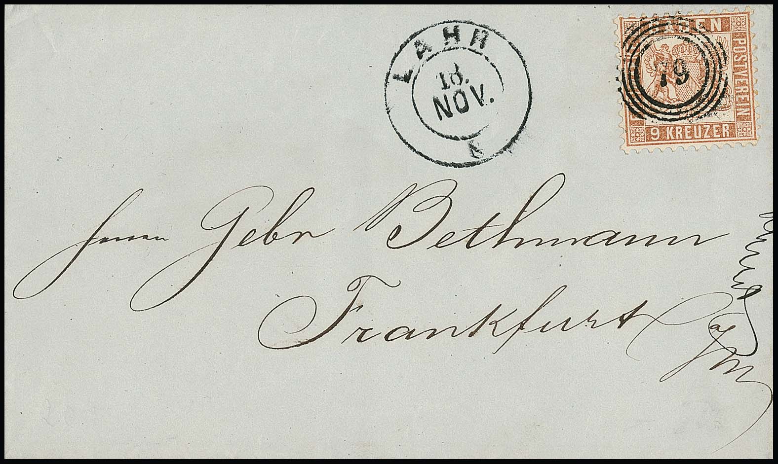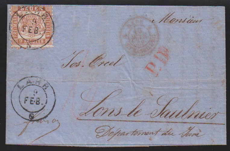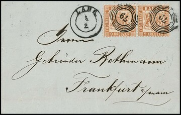 9 Kr. rötlich- und gelbbraun, zwei Pracht-/Kabinettbriefe aus Lahr, mit K2 nach Frankreich, sowie mit NS "79" nach Frankfurt