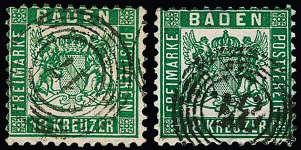 18 Kr. gelbgrün mit NS "17" (Boxberg), sign. Rohr, Richter, Unverfehrt, dazu 18 Kr. dunkelgrün (falzhell) mit NS "87" (Mannheim), Mi. 3700,-
