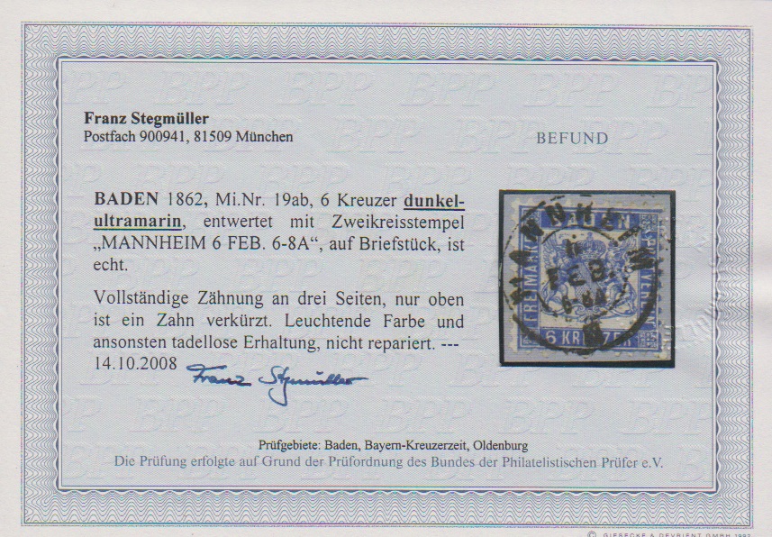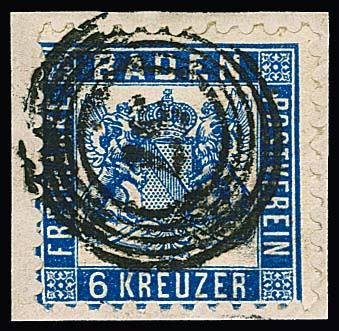 6 Kr. dunkelultramarin (oben ein Zahn etwas verkürzt) auf prachtvollem Briefstück mit zentrischem K2 "Mannheim", Fotoexp. Stegmüller. Mi. 700,-