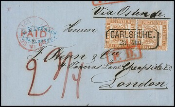 9 Kr. gelbbraun, senkrechtes Paar (untere Marke Bugspur) auf Auslands-Faltbrief mit Ra2 "Carsruhe" nach London 1868. Mi. 600,-