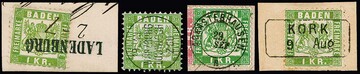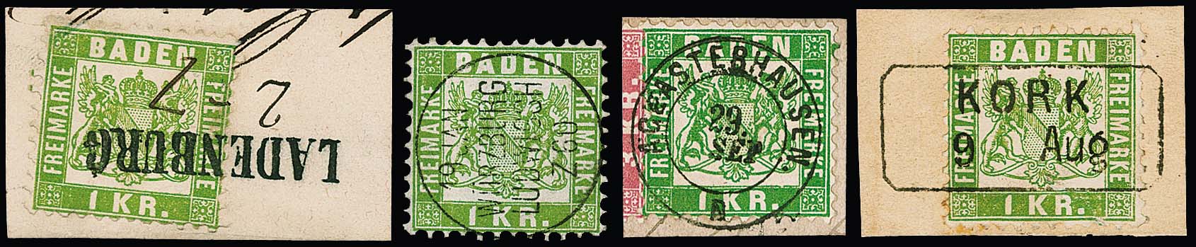 1 Kr. grün, acht schön gestempelte Exemplare, teils Luxusstücke, u.a. voller L1 "Ladenburg" auf Briefstück, Zug-K1 "Würzburg-Ludwigsh.", Postablage "Albruck-Tiefenstein" usw.