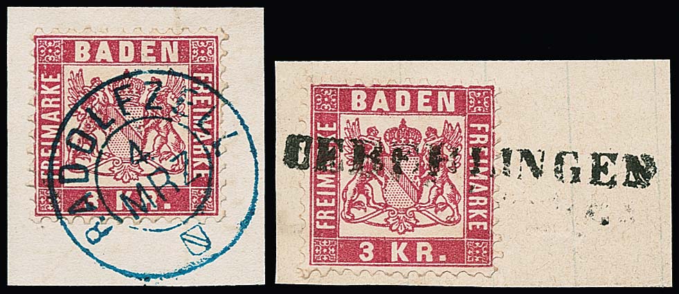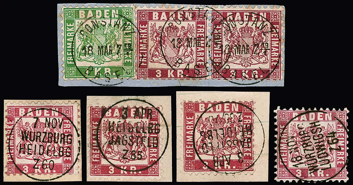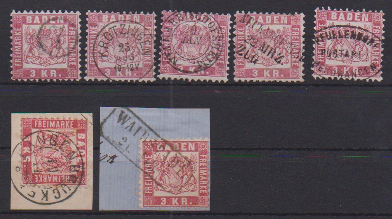 3 Kr. rosa, neun Werte (teils Luxus) mit teils besonders schönen oder besseren Abstempelungen, dabei Uhrrad "7", voller L1 "Ueberlingen" auf Kabinettbriefstück, blauer K2 "Radolfzell" auf Luxusbriefstück usw.