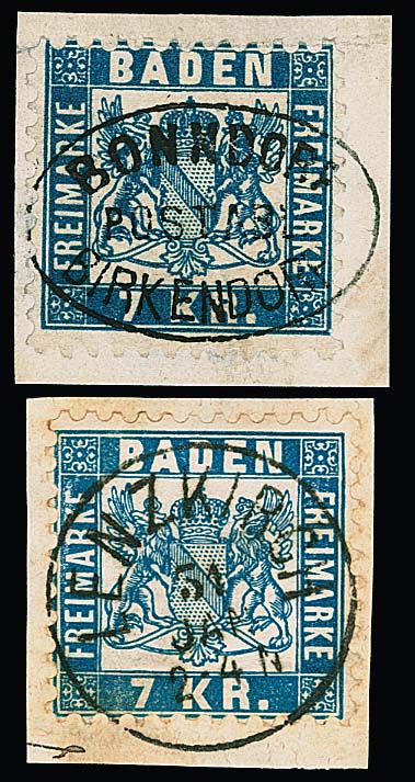 7 Kr. blau, zwei schön gest. Kabinettbriefstücke, ideal zentr. K1 "Lenzkirch" sowie Postablage "Bonndorf-Birkendorf"