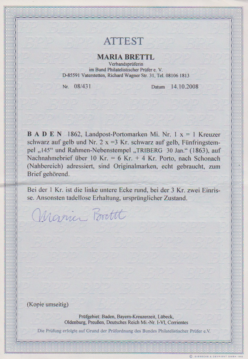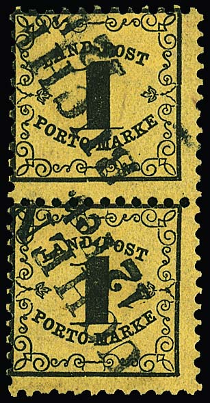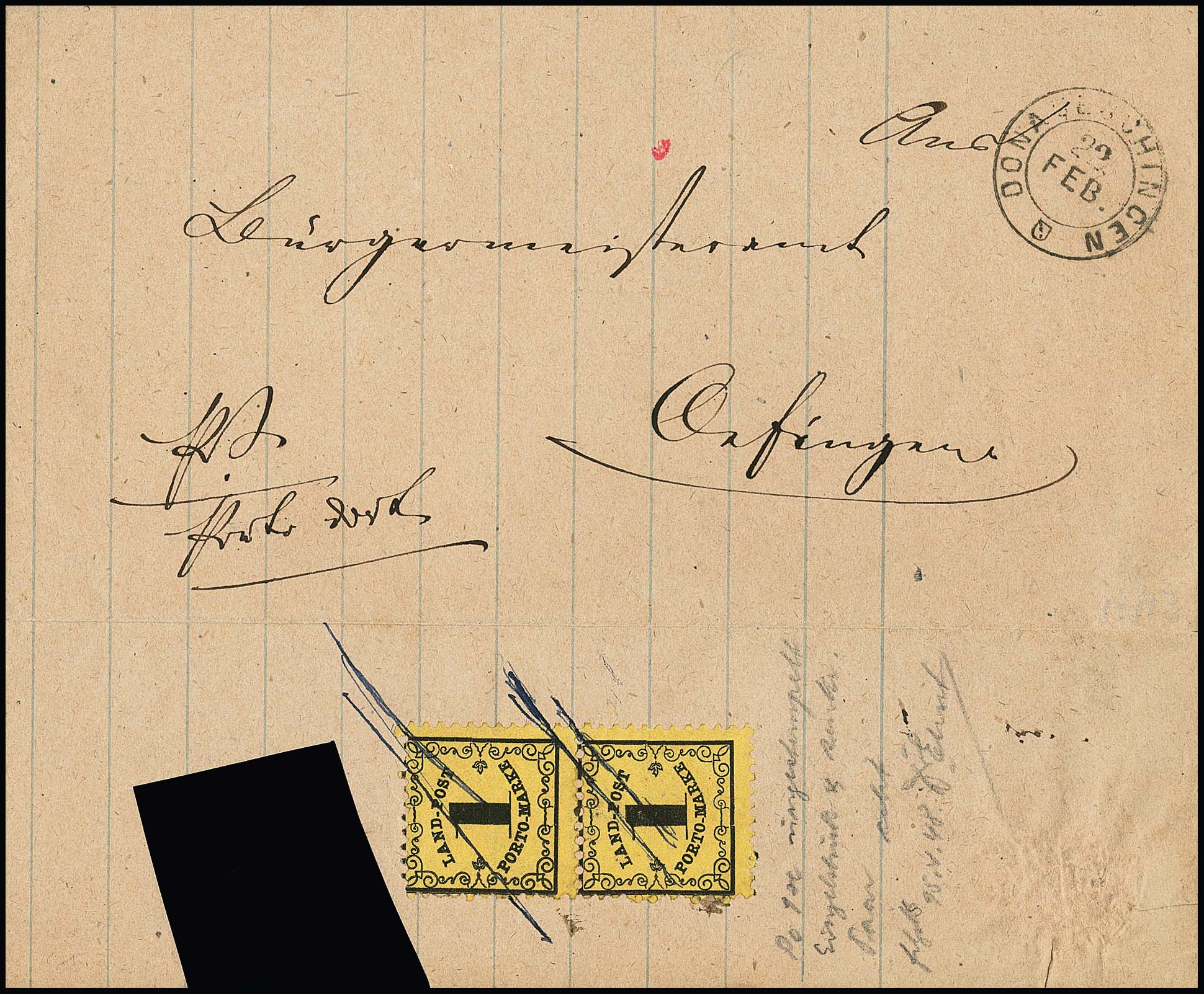Landpost 1 Kr. schw./gelb, waagerechtes Paar in guter Erhaltung rückseitig auf Brief mit handschriftlicher Entwertung von Donaueschingen nach Efringen, sign. Ehret