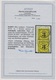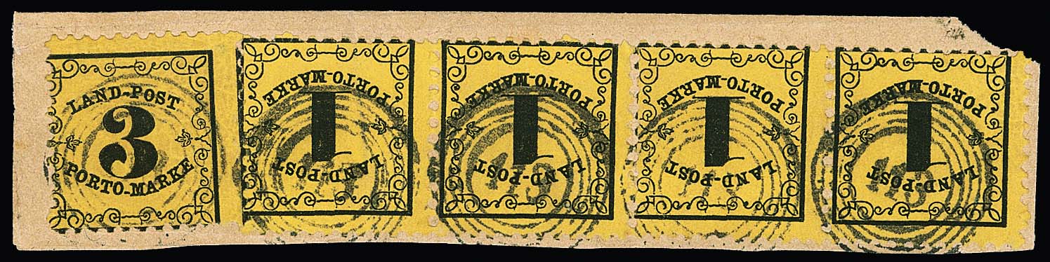 Landpost 1 Kr. schw./gelb, zwei gezähnte Paare (eines Bugspur) nebst 3 Kr. schw./gelb auf Briefstück mit NS "113" (Gailingen), sign. Seeger. Mi. 2150,- +, bei uns zuerst registriert Grobe 1958