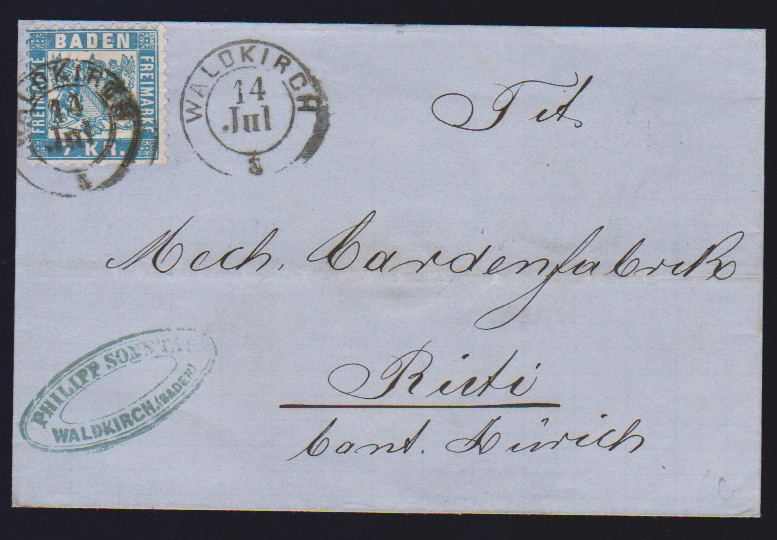 7 Kr. blau, zwei gef. Prachtbriefe aus gleicher Korrespondenz von "Waldkirch" (K2) 1869 nach Rüti b. Zürich