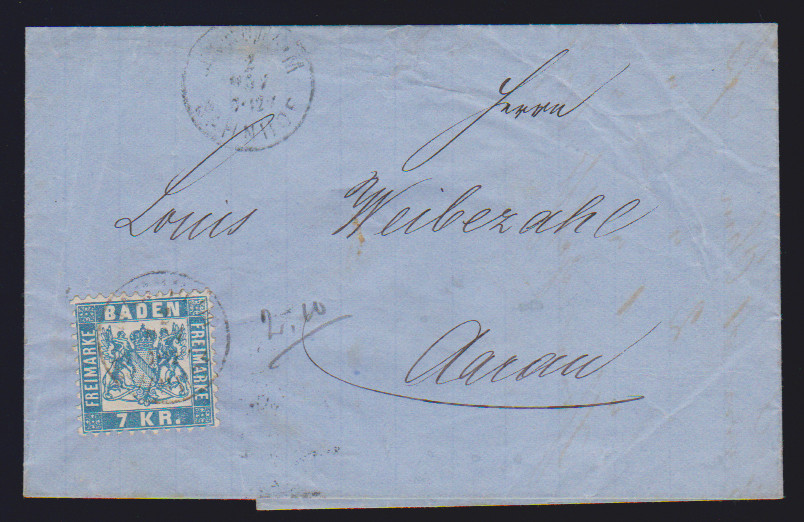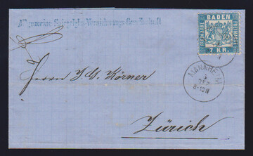 7 Kr. blau, drei Pracht-/Kabinettbriefe je mit unterschiedlichen Schweiz-Destinationen (Zürich, Basel, Aarau), alle von Mannheim. Mi. 390,-