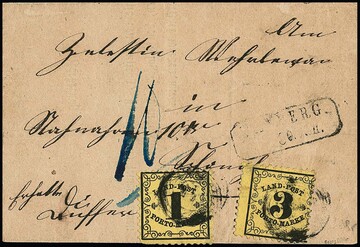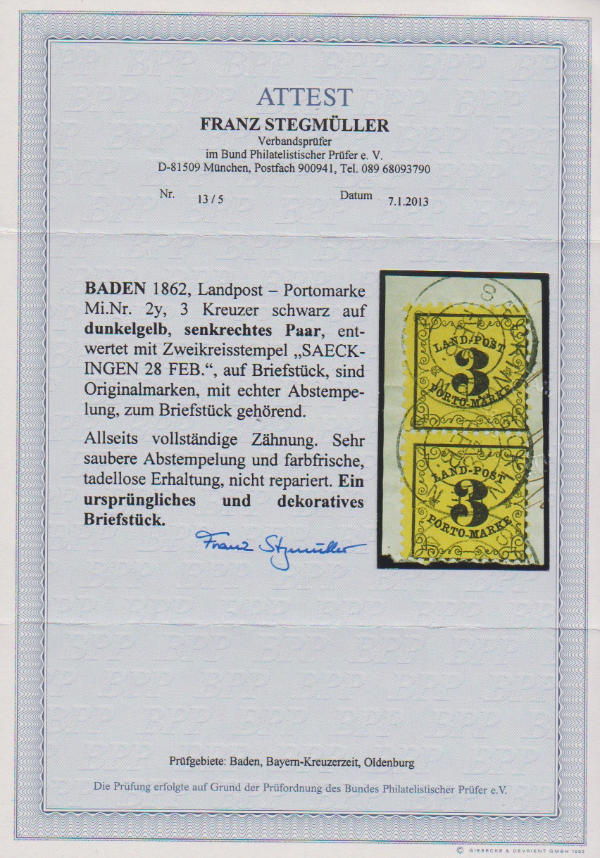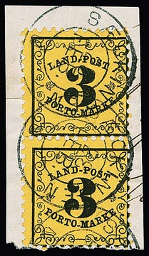 Landpost 3 Kr. schw./dunkelgelb, senkrechtes Paar auf Kabinettbriefstück mit K2 "Saeckingen", schöne und frische Einheit von der guten Farbe! Attest Stegmüller. Mi. 1200,-