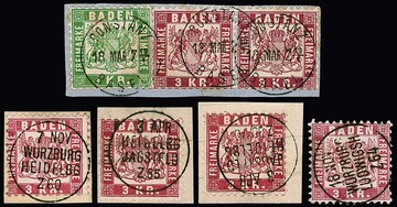 1 Kr. grün bzw. 3 Kr. rosa, acht Briefstücke und drei lose Marken je mit Bahnpoststempeln, dabei seltene. Inkl. K1 "Constanz-Basel", "Constanz-Donaueschingen", "Würzburg-Ludwigsh.", "Würzburg-Heidelberg", "Heidelberg-Jagstfeld" und umgekehrt etc.