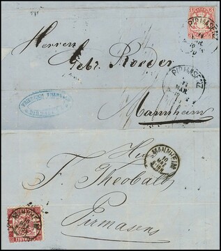 3 Kr. rosa auf Wendebrief von Mannheim nach Pirmasens, von dort mit Bayern Wappen 3 Kr. rosa zurück nach Mannheim, gut zeigbar, Gebrauchsmgl.