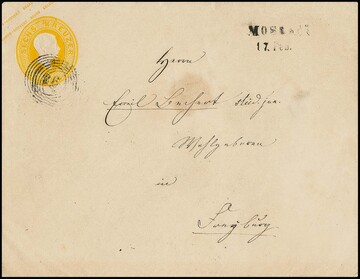 Ganzsache 6 Kr. gelborange, erste Ausgabe, prachtvolles Couvert im seltenen Großformat mit nur minimalen Gebrauchsspuren, gebraucht mit NS "93" und L2 "Mosbach", Mi. 1000,-
